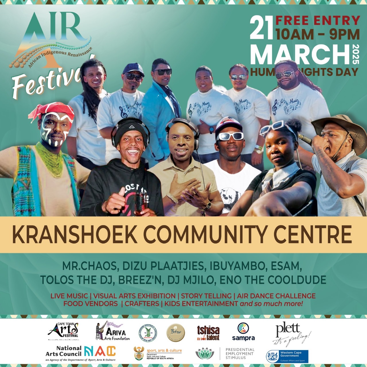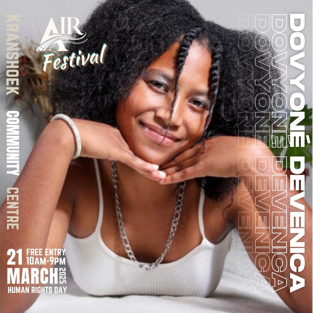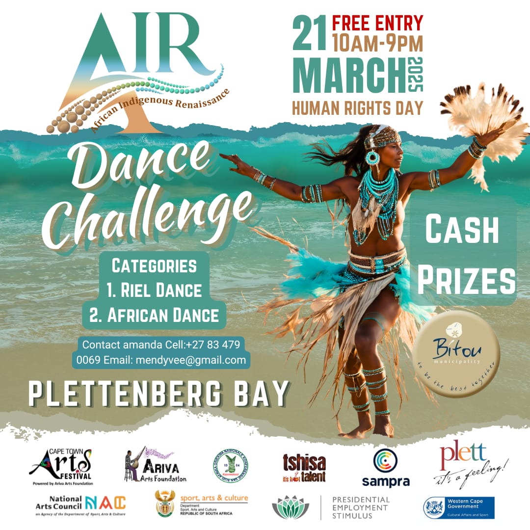 The African Indigenous Renaissance (AIR) Festival is proudly presented by the Cape Town Arts Festival in partnership with Ariva Arts Foundation and supported by Bitou Municipality, Griqua National Conference, Plettenberg Bay Tourism, and Tshisa Talent. It is funded by the National Arts Council of South Africa (NAC), the Department of Sport, Arts and Culture (DSAC), the Presidential Employment Stimulus Program (PESP5), Western Cape Government Cultural Affairs and Sport (DCAS), and the South African Music Performance Rights Association (SAMPRA) Development Fund.